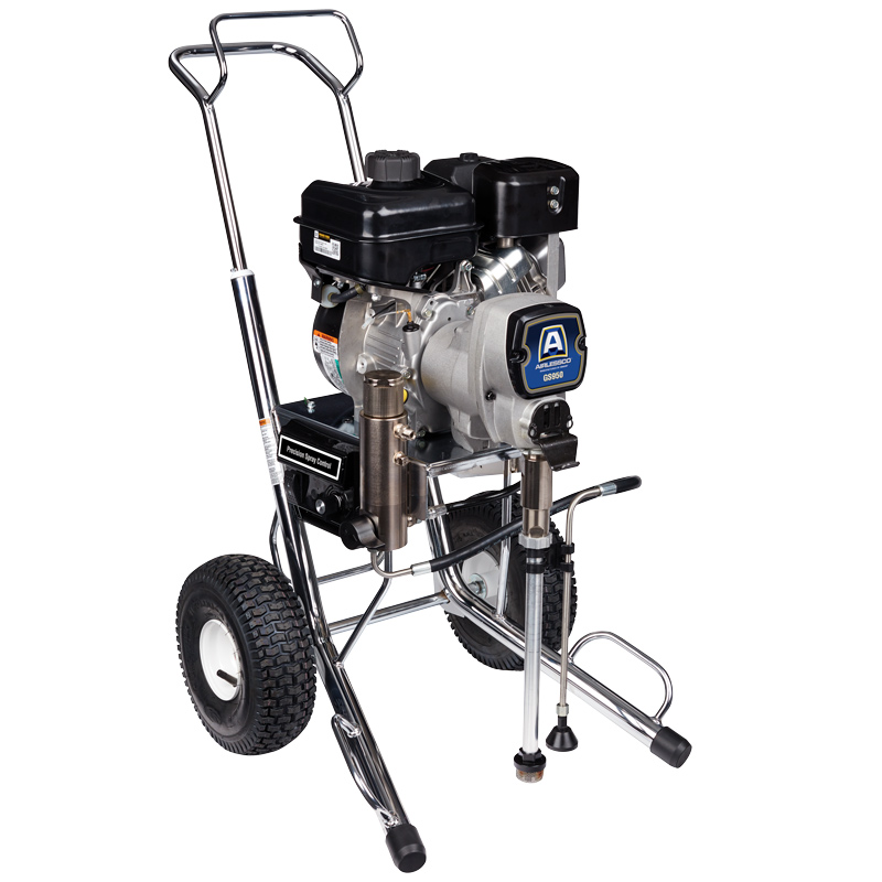 GS-seriens bensindrivna högtrycksfärgsprutor erbjuder mångsidighet i situationer där det är svårt att få åtkomst till elektricitet. Sådana situationer uppstår ofta i samband med nybyggen eller stora jobb där man flyttar runt till olika platser. I dessa färgsprutor kombineras Pro-Duty-pumpen med en pålitlig Vanguard® bensinmotor som är CARB/EBA-certifierad och försedd med en oljevakt som varnar om oljenivån blir låg.